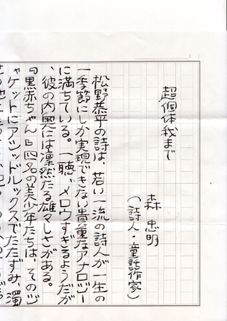 『松野恭平の詩は、若い一流の詩人が一生の一季節にしか実現出来ない貴重なアナロジーに満ちている。一聴、メロウすぎるようだが、彼の内奥には凛然たる雄々しさがある。『黒赤ちゃん』四名の美少年たちは、そのジャケットにアシッドルックスでたたずみ、濁世の地上をいささか呪っているかのようだ。しかし、かれらの演奏はあくまでも愛する大地に根ざしたものであり、優しくかつ厳しく、強い思想が感じられる。いわば宇宙的風雅曲集『少年ユニヴァースの地球儀』によって、私の古頭認識論は、俗悪きわまる社会我から麗しの超個体我へと、たとえたまゆらであっても、実にうれしく溶解されたのだった。』